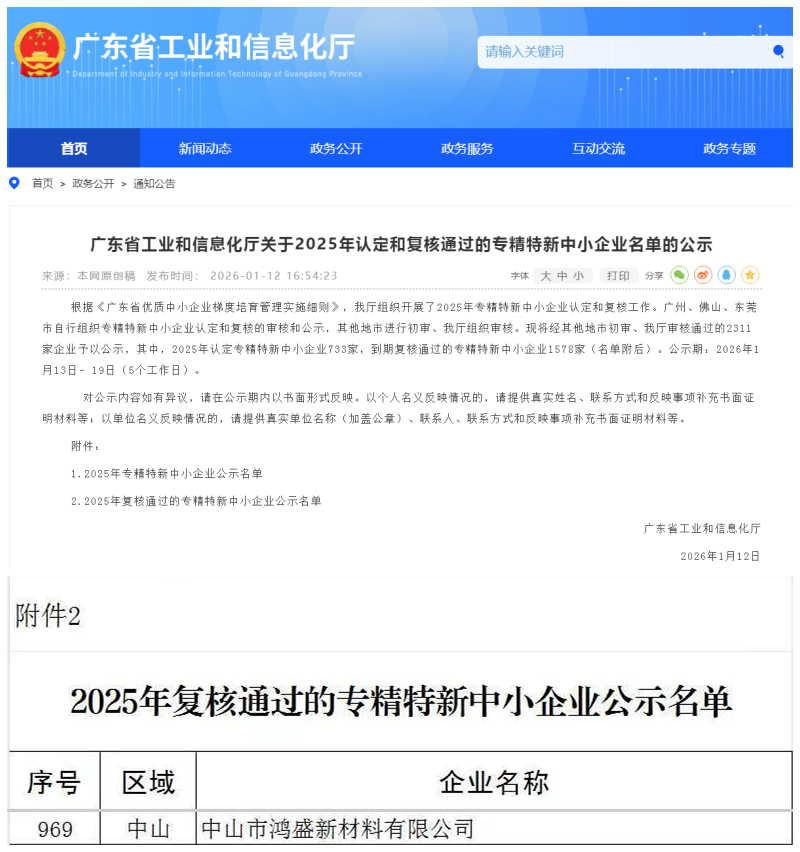中山市鸿盛新材料有限公司凭借其在新材料领域的持续创新与卓越表现,顺利通过复核,再次被认定为“广东省专精特新中小企业”。